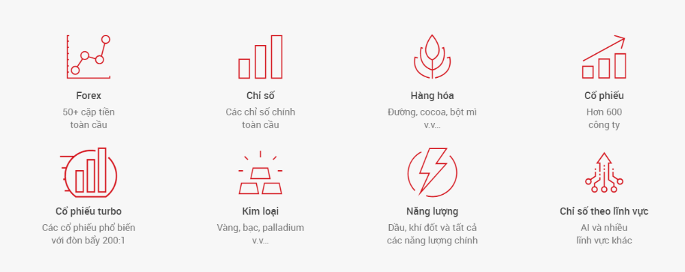 - Dầu và khí đốt: Cho phép giao dịch với khoản đặt cọc thấp chỉ với 5 USD và không mất phí qua đêm đối với dầu