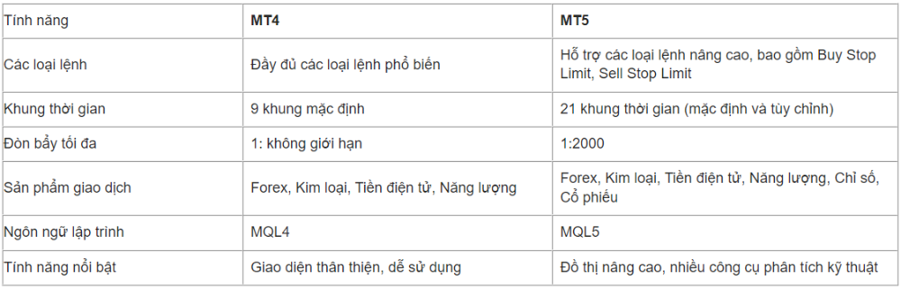 So sánh hai nền tảng MT4 và MT5 của Exness, ta thấy rõ sự khác biệt về đòn bẩy, sản phẩm giao dịch, khung thời gian và ngôn ngữ lập trình. MT5 nổi bật hơn với khả năng giao dịch cổ phiếu, số lượng chỉ báo và công cụ phân tích đa dạng hơn, cũng như hỗ trợ các loại lệnh chờ phức tạp như Buy Stop Limit và Sell Stop Limit. Tuy nhiên, cả hai nền tảng đều được tối ưu hóa cho giao dịch di động trên iOS và Android.